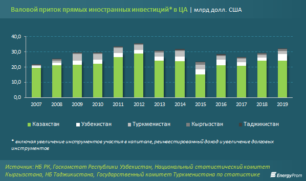 В рассматриваемом периоде 2007–2019 годов на Казахстан пришлось 77,7% от валового притока прямых иностранных инвестиций. При этом Казахстан — крупнейшая страна региона, на которую приходится более 60% ВВП.