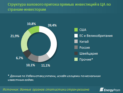 Основные инвесторы в Центральную Азию — страны Европейского союза. Доля ЕС в прямых инвестициях составила около 40%, а объём безвозмездной помощи — 1 миллиард евро