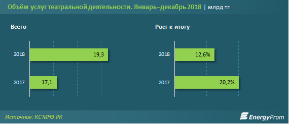 По итогам четырёх кварталов 2018 года объёмы услуг театральной деятельности достигли 19,3 млрд тенге — на 12,6% больше, чем год назад. Для сравнения: годом ранее услуги в театральной деятельности увеличились на 20,2% за год, до 17,1 млрд тг.