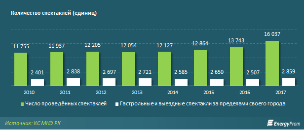 Число спектаклей к началу прошлого года выросло на 16,7% за год, до 16 тысяч, из них количество гастрольных и выездных спектаклей увеличилось на 14%, до 2,9 тысячи.