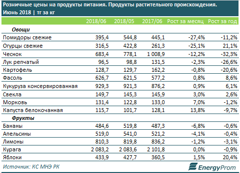 По итогам июня сезонные овощи радуют продолжающимся падением цен: свежие помидоры подешевели к маю на 27,4%, огурцы — на 25,1%, чеснок — на 12,2%, лук — на 2,3%, картофель — на 0,8%.