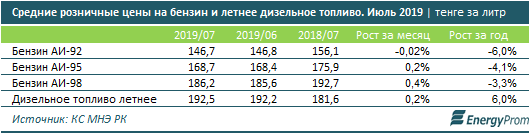 Цены на бензин и дизельное топливо относительно стабильны. За месяц средние показатели в рознице почти не изменились: так, бензин популярной марки АИ-92 подешевел на 0,02%, до 146,7 тенге по итогам июля; АИ-95 и летнее дизтопливо, наоборот, подорожали на 0,2%, до 168,7 и 192,5 тенге за литр соответственно. Бензин марки АИ-98 подорожал за месяц на 0,4%, до 186,2 тенге за литр.