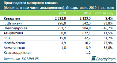 За январь–июль выпуск моторного топлива (бензина, включая авиационный) в Шымкенте достиг 996,8 тыс. тонн — на 83,8% больше, чем в прошлом году. В Павлодарской области объём сократился на 16,7%, до 753,7 тыс. тонн; в Атырауской зафиксировано сокращение выпуска на 11,5%, до 550,8 тыс. тонн.
