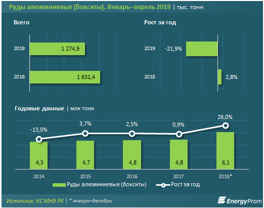 Гигант отрасли — АО «Алюминий Казахстана», занимающееся добычей и обогащением бокситов на Торгайском бокситовом рудоуправлении (ТБРУ) и Краснооктябрьском бокситовом рудоуправлении (КБРУ) в Костанайской области. Напомним, что это единственная в Казахстане компания, выпускающая сырьё для производства алюминия — глинозём*. Компания входит в группу компаний Eurasian Resources Group (ERG).