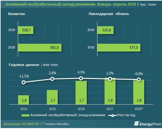 Вместе с сокращением добычи руды производство необработанного алюминия также ушло в минус — на 9% за год, до 528,7 тыс. тонн. 99,4% всего производства пришлось на Павлодарскую область (525,8 тыс. тонн, −9% за год), где действует ещё одна формация ERG — АО «Казахстанский электролизный завод» (КЭЗ). Это первый и единственный в Казахстане производитель первичного алюминия* высокой марки. Рынки сбыта — Россия, Беларусь, Узбекистан, страны Южной и Центральной Европы.