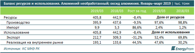По итогам I квартала текущего года собственное производство в РК перекрывает потребности в необработанном алюминии и его оксидах на 97,6%. В то же время экспорт сократился сразу на 31,2%.