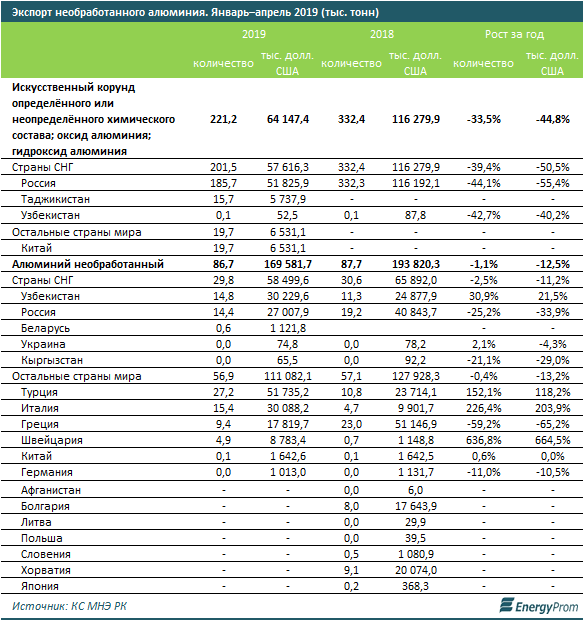 Продажи необработанного алюминия на внешние рынки за 4 месяца 2019 года в натуральном выражении сократились на 1,1%, в денежном — на 12,5%. Главные импортёры алюминия — Турция, Италия и Узбекистан.