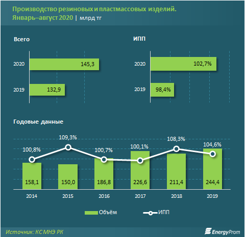 Объём производства резиновых и пластмассовых изделий в РК за январь–август 2020 года составил 145,3 млрд тг, что в денежном выражении на 9,3% больше по сравнению с прошлым годом (при этом ИПП — всего 102,7%).