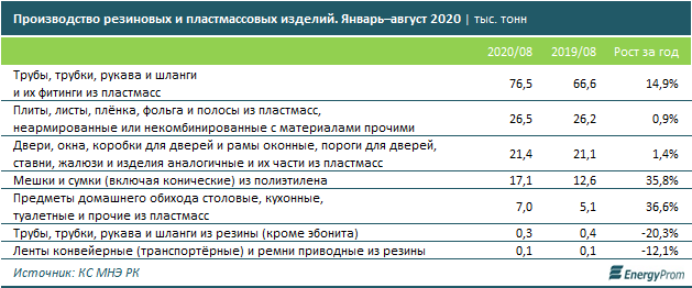 В натуральном выражении по сравнению с январём–августом прошлого года рост показали только продукты из пластмассы: так, производство пластмассовых предметов домашнего обихода выросло на 36,6%, до 7 тыс. тонн; мешков и сумок — на 35,8%, до 17,1 тыс. тонн; вырос также выпуск труб и шлангов и их фитингов из пластмассы — на 14,9%, до 76,5 тыс. тонн.