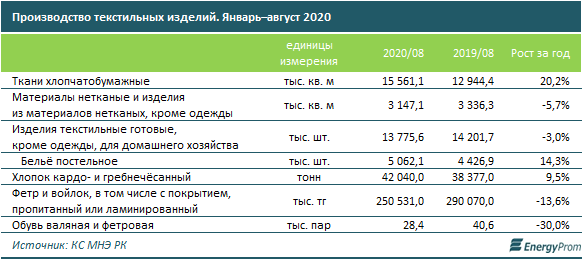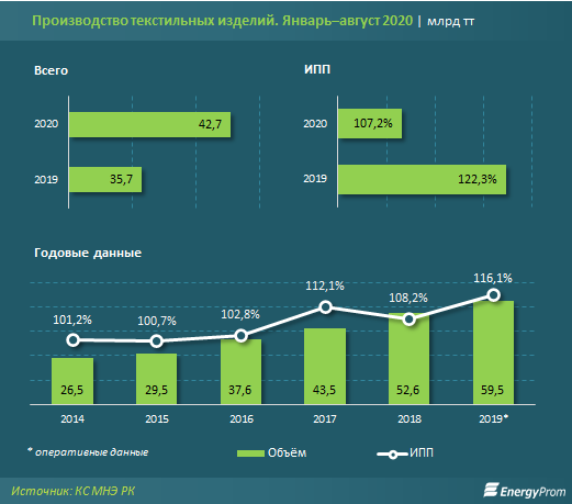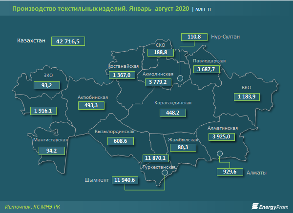 Производство текстильных изделий за январь–август 2020 года в денежном выражении достигло 42,7 млрд тг — на 19,6% больше по сравнению с аналогичным периодом прошлого года (ИПП — 107,2%).