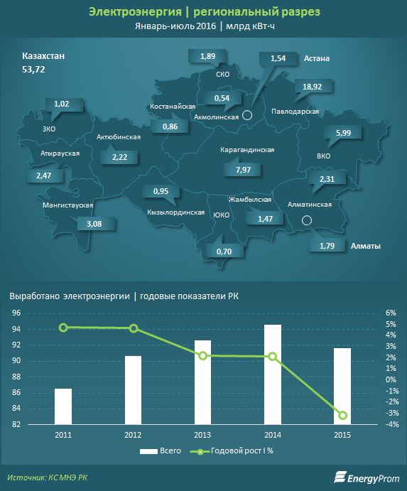 Прирост генерации связан с введением новых генерирующих мощностей. В Южно-Казахстанской области введены солнечные электростанции — СЭС «Очистной» ТОО «Акcу-Энерго», СЭС «Акбай» ТОО «Акcу-Энерго». В Акмолинской области введен в эксплуатацию ТОО «ПВЭС» ВЭС «Ерейментау» установленной мощностью 45МВт, а также АО «Астана-Энергия» увеличила выработку электроэнергии в 1 полугодии 2016 года. В Актюбинской области введена в эксплуатацию ГПЭС «АРБЗ». В Восточно-Казахстанской и Алматинской областях прирост генерации в 1 полугодии 2016 года вызван увеличением выработки на гидроэлектростанциях (ГЭС), что обусловлено увеличением расходов воды. Рост генерации в 1 полугодии 2016 года в Северо-Казахстанской области связан с наращиванием мощностей на ППТЭЦ-2 АО «СевКазЭнерго», которая ввела в эксплуатацию новый турбоагрегат установленной мощностью 63 МВт.