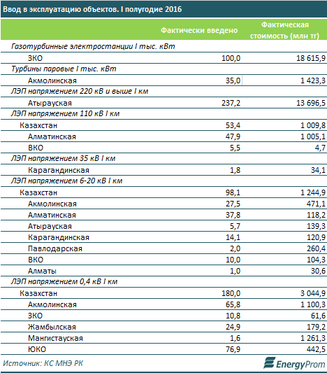 За I полугодие были введены мощности на ГТЭС Западно-Казахстанской области на 100 тыс. кВт. Фактическая стоимость введенных объектов составила 18,6 млрд тг.