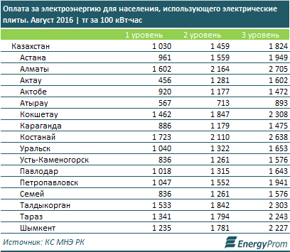 Оплата за электроэнергию для населения, использующего электрические плиты, в августе составила в среднем по РК 1030 тг за 100 кВт·час для 1 уровня* (плюс 3,6% год-к-году), 1459 тг — для 2 уровня (плюс 4,2%), и 1824 тг — для 3 уровня (также плюс 4,2%).