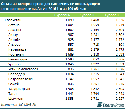 Тарифы для населения, не использующего электрические плиты, выросло до 1099 тг за 100 кВт·час на 1 уровне, 1468 тг за 100 кВт·час на 2 уровне и 1836 тг за 100 кВт·час — на третьем (рост год-к-году для всех уровней — плюс 4,9%).