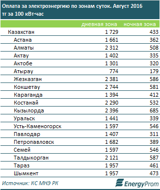 Самая высокая цена для дневной зоны — в Кокшетау (2744 тг за 100 кВт·час, плюс 3,6% за год), для ночной — в Кызылорде (685 тг за 100 кВт·час, плюс 12,6%).