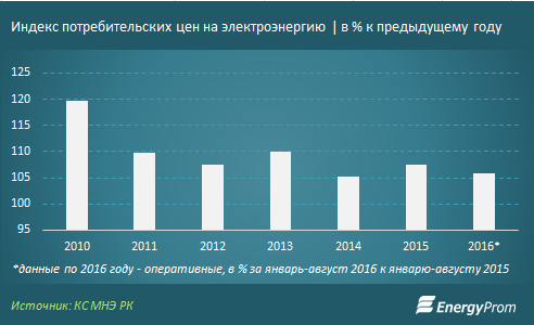ИПЦ на электроэнергию составил в среднем по РК 105,8% (за январь-август 2016 к январю-августу 2015).