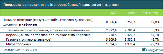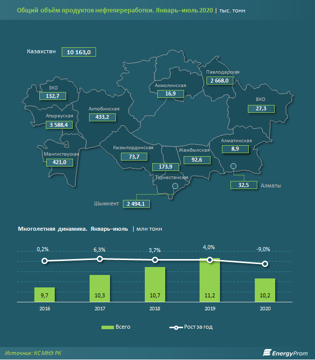 За январь–июль 2020 года общий объём производства продуктов переработки нефти в стране составил 10,2 млн тонн — на 9% меньше, чем годом ранее.