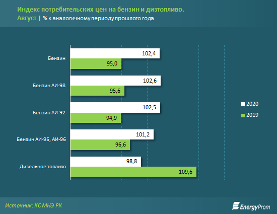 В августе 2020 года бензин подорожал на 2,4% по сравнению с августом прошлого года. Наибольший рост цен зафиксирован в Жамбылской (на 5,7%) и Алматинской (на 4,3%) областях, а также в Алматы (на 4,2%).