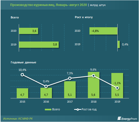 За январь–август 2020 года птицеводы страны получили 3,6 млрд куриных яиц — на 4,8% меньше, чем в прошлом году. В том числе 2,7 млрд яиц получили сельхозпредприятия, 899,4 млн яиц — хозяйства населения, 18,5 млн яиц — индивидуальные предприниматели и крестьянские или фермерские хозяйства.