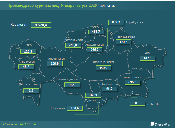В региональном разрезе наибольший объём производства пришёлся на Алматинскую область: 696 млн яиц — на 3,8% меньше, чем годом ранее. В тройку лидеров также вошли Акмолинская (566,2 млн яиц, минус 4,5%) и Северо-Казахстанская (458,7 млн яиц, минус 17,5%) области.