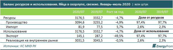 По итогам семи месяцев казахстанские компании обеспечили спрос (экспорт плюс реализация на внутреннем рынке) на свежие яйца в скорлупе на 97,4%.
