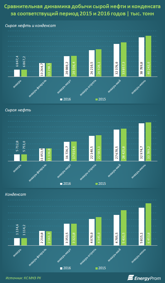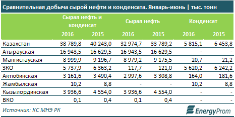 В первом полугодии 2016 года валовая добыча сырой нефти и газового конденсата в Казахстане продемонстрировала сокращение по сравнению с аналогичным периодом 2015 года на 3,6% до 38,8 млн тонн. В том числе производство сырой нефти составило 32,97 млн тонн или на 2,4% меньше в годовом сопоставлении, газового конденсата – 5,8 млн тонн или соответственно на 9,9% меньше.