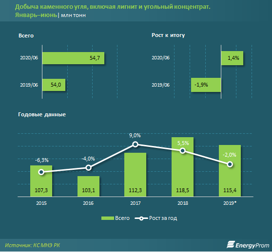 За первое полугодие в стране добыли 54,7 млн тонн каменного угля, лигнита и угольного концентрата — на 1,4% больше, чем годом ранее. В том числе 50,5 млн тонн составил каменный уголь, 2,2 млн тонн — лигнит (бурый уголь), 2,1 млн тонн — угольный концентрат.