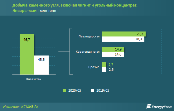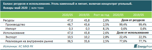 По итогам пяти месяцев казахстанские добытчики обеспечили спрос (экспорт плюс реализация на внутреннем рынке) на уголь на 99,4%.