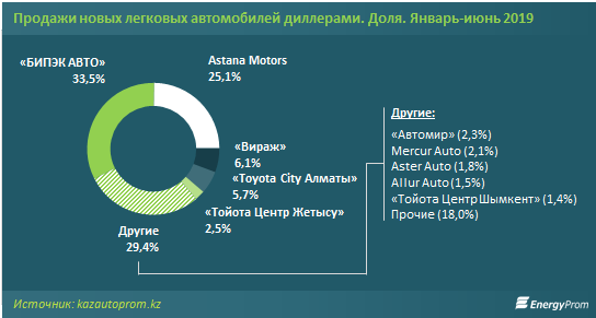 Более трети всех продаж совершено дилерской группой «БИПЭК АВТО», четверть — КМК «Astana Motors»