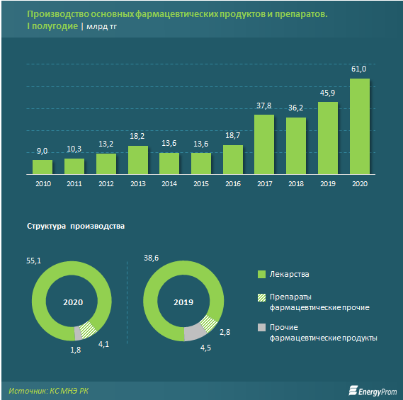 Непосредственно производство лекарств в январе–июне 2020 года составило 55,1 млрд тг, против лишь 38,6 млрд тг годом ранее; выпуск прочих фармацевтических препаратов — 4,1 млрд тг, против 2,8 млрд тг год назад.