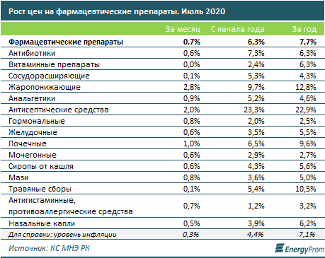 В то же время, несмотря на рост как производства, так и импорта, «коронавирусный» ажиотаж привёл к заметному росту цен. Так, за июль фармацевтические препараты в РК подорожали сразу на 0,7%, при средней инфляции по стране на уровне 0,3%. С начала года рост цен составил 6,3% (при инфляции в 4,4%), а в сравнении с июлем 2019 года — 7,7% (при годовой инфляции в 7,1%). Сильнее всего за месяц подорожали жаропонижающие (на 2,8%) и антисептики (на 2%).