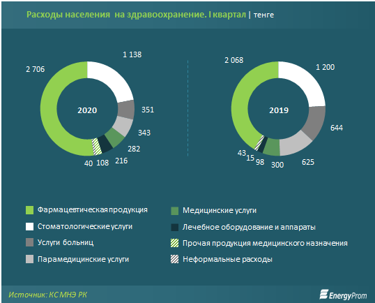 В общем объёме трат казахстанцев расходы на здравоохранение занимали 2,9%, в структуре расходов на платные услуги — 16,6%. Для сравнения: годом ранее доля здравоохранения от всех расходов составляла 3,1%, однако от платных услуг — всего 14,3%.