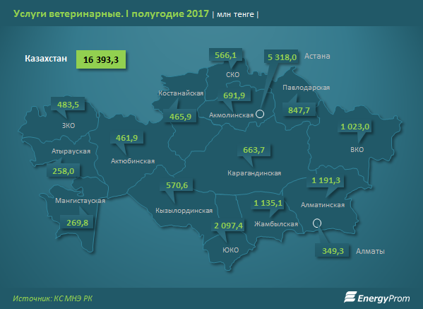 Также в тройке лидеров по объемам ветеринарных услуг по итогам полугодия — ключевые животноводческие регионы: ЮКО (12,8% от РК — 2,1 млрд тг, минус 4,9% за год) и Алматинская область (7,3% от РК — 1,2 млрд тг, минус 4,7% за год).