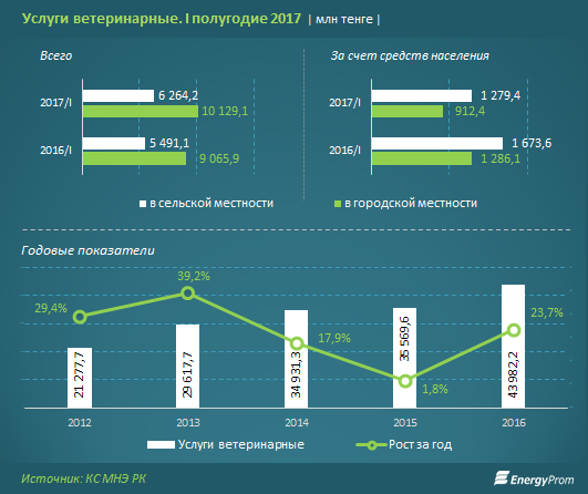 По итогам I полугодия текущего года объем ветеринарных услуг по РК достиг 16,4 млрд тг — на 12,6% больше, чем в аналогичном периоде годом ранее.