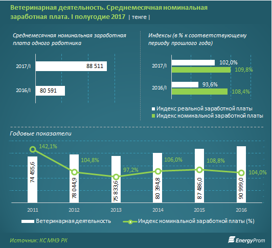 Заработные платы специалистов, занятых ветеринарной деятельностью, по итогам I полугодия составляли 88,5 тысячи тенге — это на 9,8% больше, чем в аналогичном периоде годом ранее.