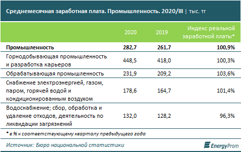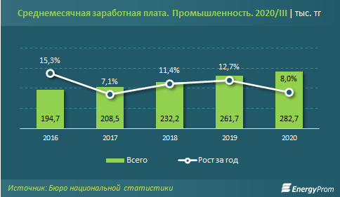 В третьем квартале текущего года среднемесячная номинальная заработная плата сотрудников предприятий промышленного сектора составила 282,7 тыс. тг — на 38,4% больше по сравнению с показателем в целом по стране (204,3 тыс. тг).