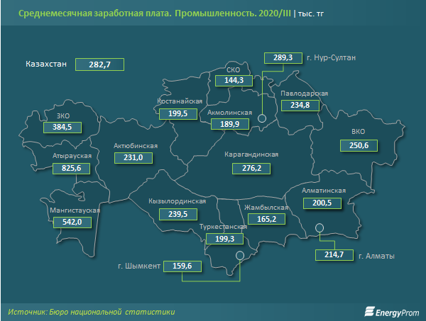 Наименьшие зарплаты — у сотрудников промышленных предприятий Северо-Казахстанской области (всего 144,3 тыс. тг), Шымкента (159,6 тыс. тг) и Жамбылской области (165,2 тыс. тг).