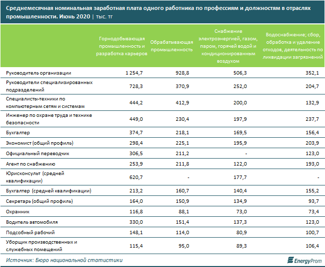 Оплата труда руководителей организаций также заметно различается по секторам: так, если в горнодобывающей промышленности в июне 2020 года среднемесячная зарплата руководителя организации составляла 1,3 млн тг, то в сегменте переработки — 928,8 тыс. тг, в электро- и теплоснабжении — 506,3 тыс. тг, в сегменте водоснабжения, водоотведения и контроля над сбором отходов — 352,1 тыс. тг.