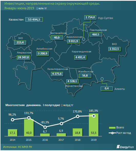 По итогам первого полугодия текущего года инвестиции, направленные на охрану окружающей среды, достигли 53,5 млрд тг, увеличившись более чем в 2,8 раза по сравнению с аналогичным периодом прошлого года (18,8 млрд тг).
