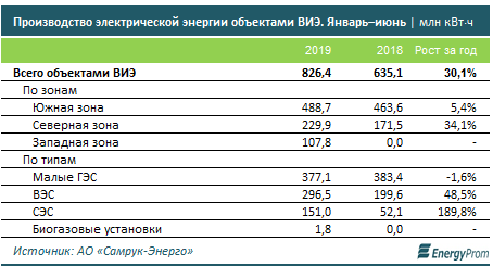 По итогам первого полугодия возобновляемыми источниками энергии было произведено 826,4 млн кВт⋅ч электроэнергии — на 30,1% больше, чем в аналогичном периоде годом ранее (635,1 млн кВт⋅ч). Больше всего электроэнергии было произведено малыми ГЭС: 377,1 млн кВт⋅ч (годом ранее — 383,4 млн кВт⋅ч). Ветровые электростанции увеличили производство на 48,5%, до 296,5 млн кВт⋅ч (годом ранее — 199,6 млн кВт⋅ч). Объём производства электроэнергии солнечными электростанциями увеличился в 2,9 раза за год и составил 151 млн кВт⋅ч (годом ранее — 52,1 млн кВт⋅ч). Биогазовыми установками было произведено 1,8 млн кВт⋅ч электроэнергии.