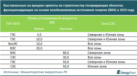 Суммарный объём установленной мощности, запланированный к отбору в 2019 году, составляет 255 МВт. Из них солнечные электростанции — 80 МВт, ветровые электростанции — 100 МВт, гидроэлектростанции — 65 МВт, биоэлектростанции — 10 МВт.