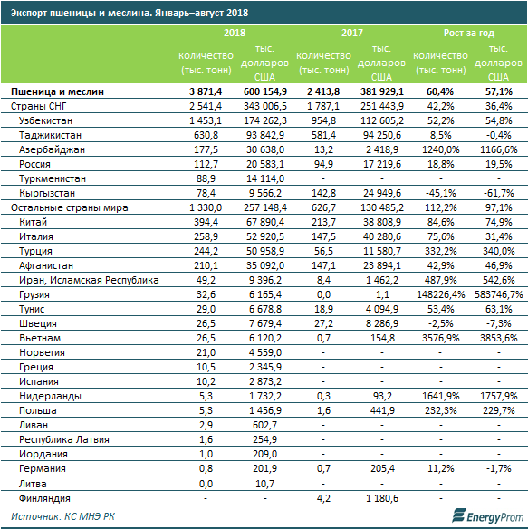 За 8 месяцев 2018 года Казахстан экспортировал 3871,4 тыс. тонн пшеницы и меслина, что на 60,4% больше, чем в аналогичном периоде годом ранее. Объём экспорта в денежном эквиваленте составил 600,2 млн долл. США (+57,1% за год).