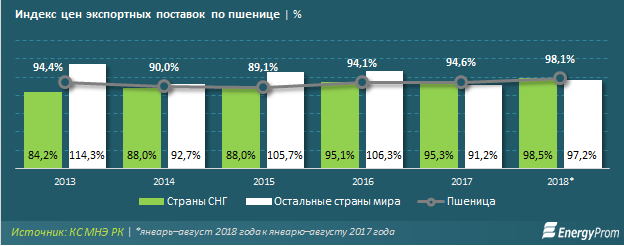 Экспортные цены на казахстанскую пшеницу для стран СНГ за январь–август 2018 года снизились на 1,5%, а для остальных стран мира — на 2,8%. В целом по итогам 8 месяцев экспортные цены на пшеницу уменьшились на 1,9%.