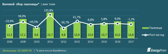 Валовой сбор пшеницы в 2017 году снизился по сравнению с 2016 годом на 1,2% и составил 14,8 млн тонн.