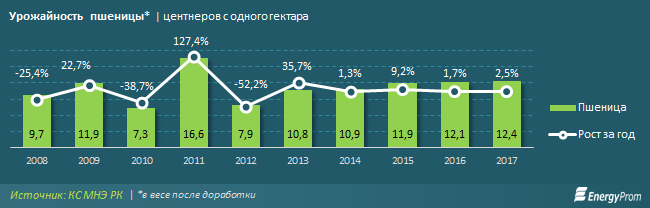 Урожайность пшеницы в 2017 году составляла 12,4 центнера с гектара, что на 2,5% больше, чем годом ранее.
