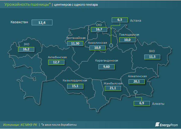 Самым урожайным регионом в 2017 году была Жамбылская область — 21,1 центнера с гектара, однако урожайность снизилась на 0,9% в сравнении с 2016-м.