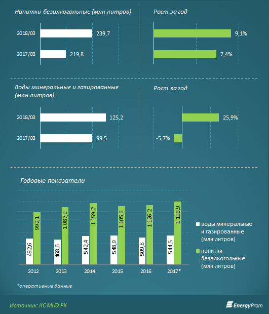 По итогам I квартала казахстанские компании произвели 239,7 млн литров безалкогольных напитков — на 9,1% больше, чем годом ранее, а также 125,2 млн литров минеральной и газированной воды — сразу на 25,9% больше, чем год назад.