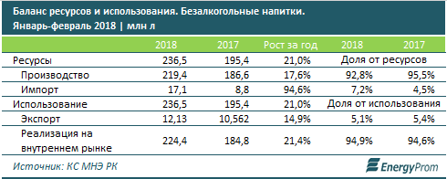 По итогам первых двух месяцев текущего года казахстанские производители обеспечили 92,8% спроса на безалкогольные напитки (по итогам 2017 года в целом было 93,2%). Примечательно, что объемы реализации напитков на внутреннем рынке РК выросли год-к-году сразу на 21,4% — пить казахстанцы стали заметно больше.