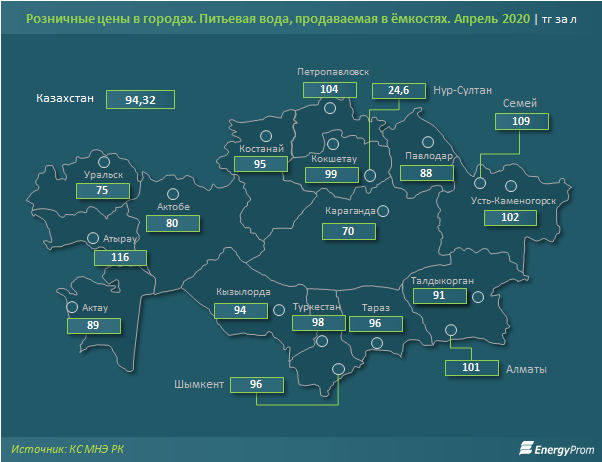 Дороже всего за возможность утолить жажду в жаркую погоду приходится платить жителям Атырау (116 тг за литр воды, продаваемой в ёмкостях), Семея (109 тг) и Петропавловска (104 тг).