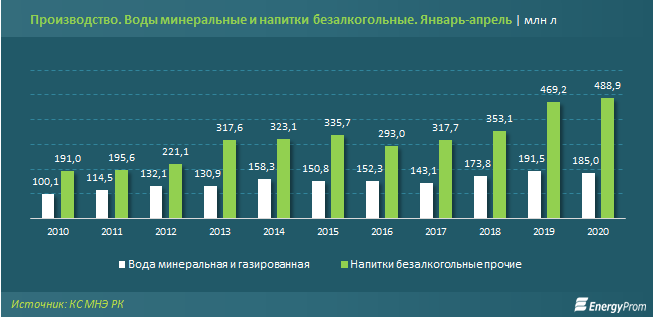 Производство минеральной и газированной воды в период пандемии COVID-19 сократилось: за январь–апрель было выпущено 185 млн литров — минус 3,4% за год. Ранее два года подряд объёмы производства в секторе стабильно росли.